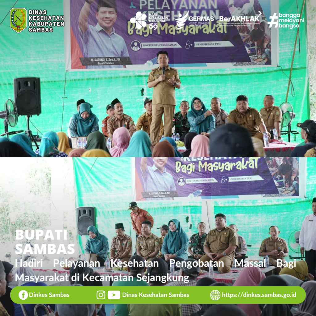 SAMBAS – Bupati Sambas H. Satono, S. Sos.I., M.H., didampingi Ketua TP-PKK Kab. Sambas Hj. Yunisa Satono, S. Pd., M. AP., bersama Kepala Dinas Kesehatan Kabupaten Sambas dr. Ganjar Eko Prabowo, M.M., menghadiri kegiatan Pelayanan Kesehatan Pengobatan Massal yang berlangsung di Pasar Tradisional Desa Parit Raja Kecamatan Sejangkung Senin ( 6/11/2023 ).