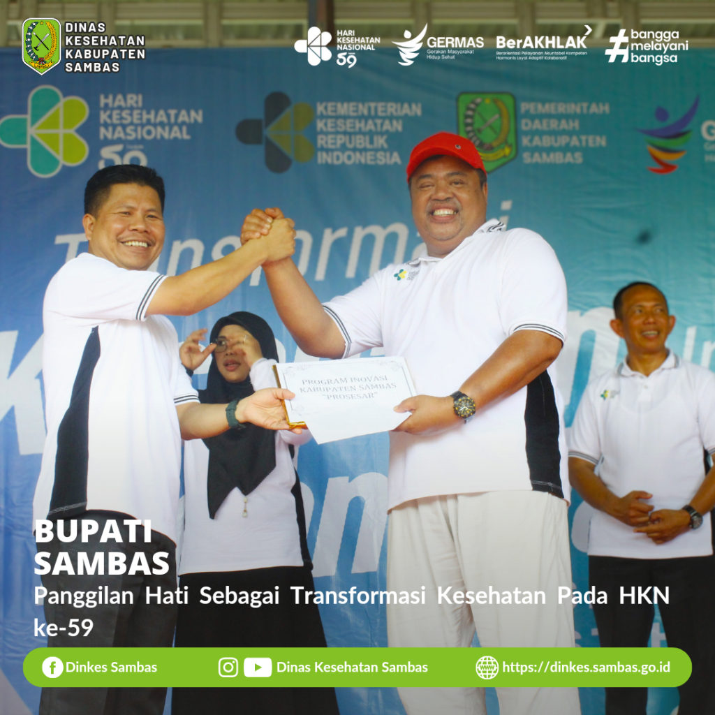 SAMBAS – Bupati Sambas H. Satono, S. Sos.I., M.H., didampingi Ketua TP-PKK Kab. Sambas Hj. Yunisa Satono, S. Pd., M. AP., bersama Kepala Dinas Kesehatan Kabupaten Sambas dr. Ganjar Eko Prabowo, M.M., menghadiri acara Puncak Peringatan Hari Kesehatan Nasional ( HKN ) ke-59 yang dipusatkan di Taman Wisata Danau Sebedang Kecamatan Sebawi Kamis ( 16/11/2023 ).