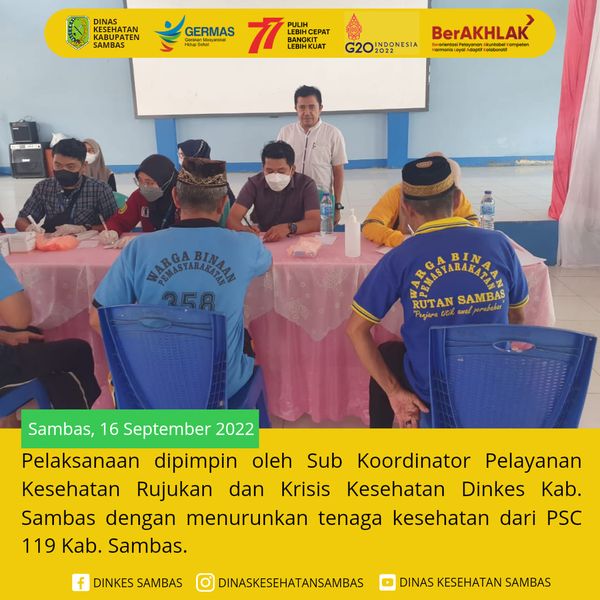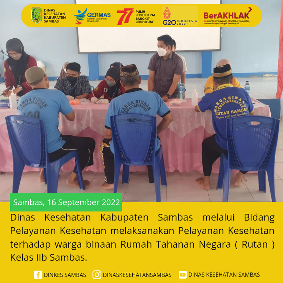 Sambas, 16 September 2022 – Dinas Kesehatan Kabupaten Sambas melalui Bidang Pelayanan Kesehatan melaksanakan Pelayanan Kesehatan terhadap warga binaan Rumah Tahanan Negara ( Rutan ) Kelas IIb Sambas.