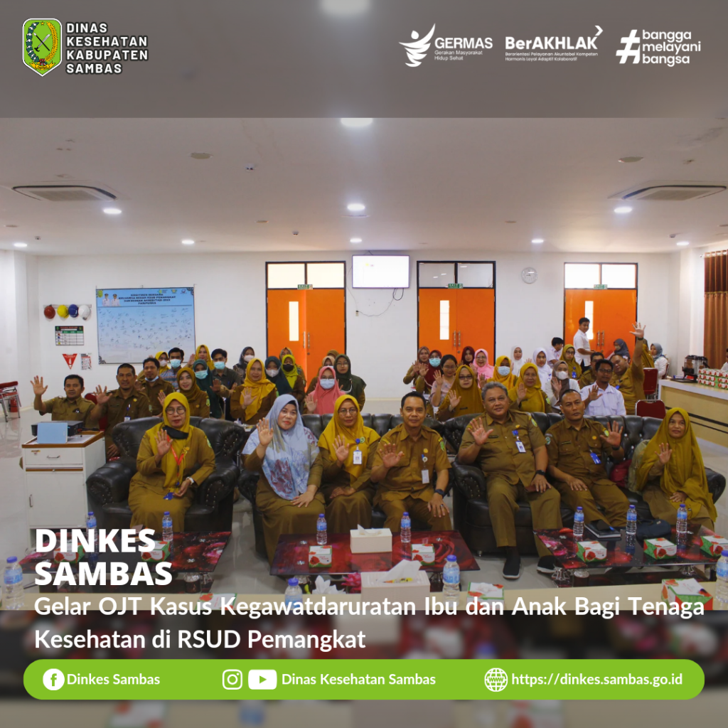 SAMBAS – Dinas Kesehatan Kabupaten Sambas melalui Bidang Pelayanan Kesehatan menggelar On the Job Training ( OJT ) Peningkatan Kapasitas Tenaga Kesehatan pada Kasus Kegawatdaruratan Maternal dan Perinatal di Aula Berkemajuan RSUD Pemangkat Senin, 18 September 2023.