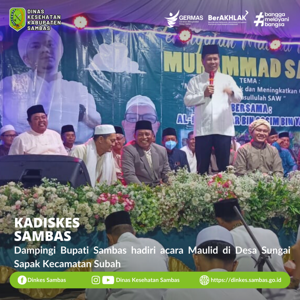 SAMBAS – Kepala Dinas Kesehatan Kabupaten Sambas dr. Ganjar Eko Prabowo, M.M., dampingi Bupati Sambas H. Satono, S. Sos.I., M.H., menghadiri Peringatan Maulid di Desa Sungai Sapak Kecamatan Subah Sabtu Malam, 7 Oktober 2023.