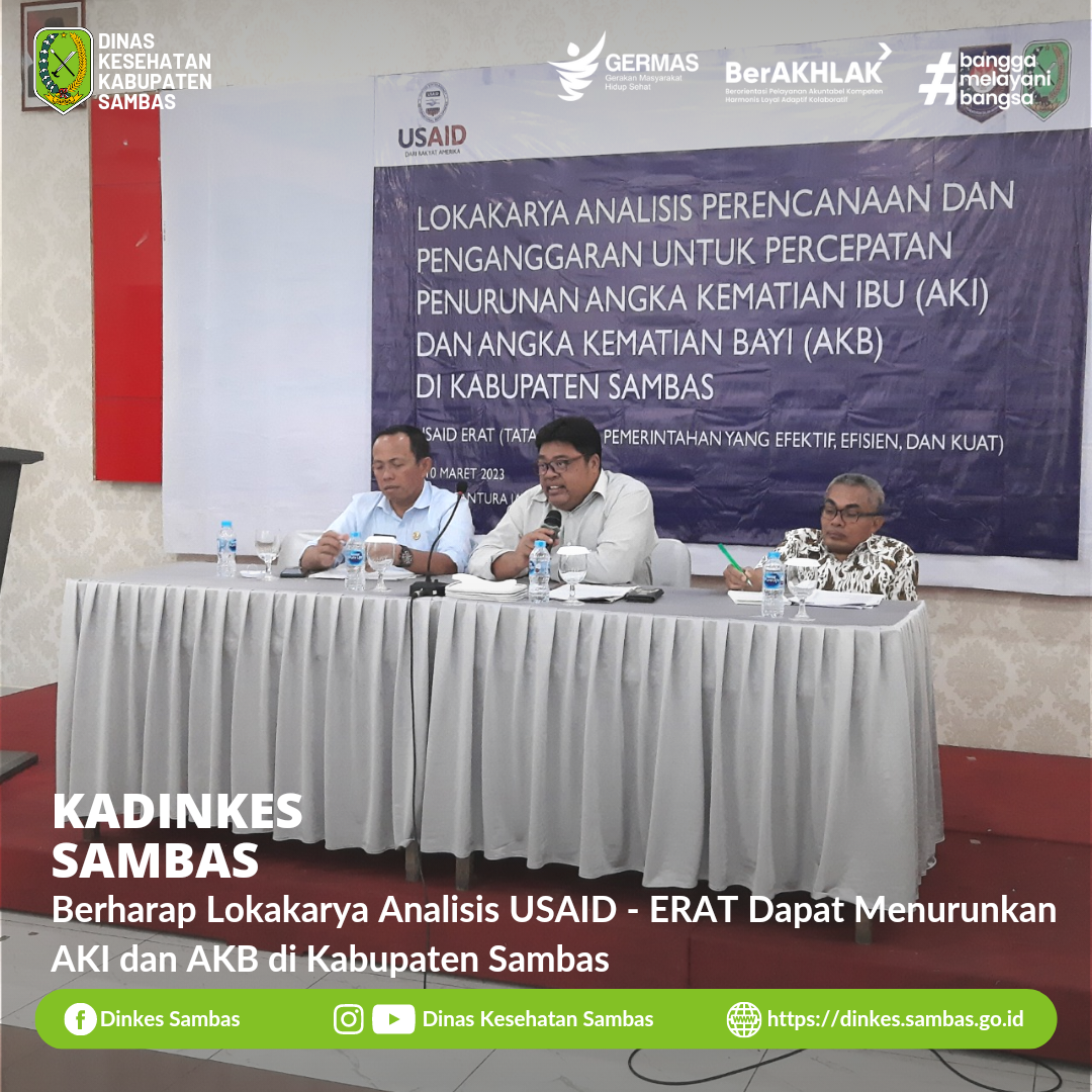 Kepala Dinas Kesehatan Kab. Sambas dalam sambutannya menyampaikan ucapan terima kasih kepada Tim USAID-ERAT yang telah mendampingi dan berkolaborasi dalam mengupayakan penurunan Angka Kematian Ibu ( AKI ) dan Angka Kematian Bayi ( AKB ) di Kabupaten Sambas.