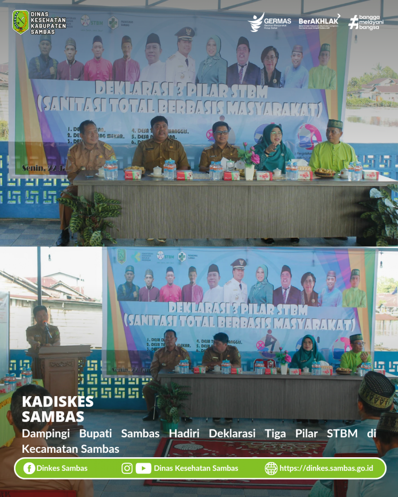 SAMBAS – Kepala Dinas Kesehatan Kabupaten Sambas dr. Ganjar Eko Prabowo, M.M., mendampingi Bupati Sambas H. Satono, S. Sos.i., M.H., bersama Ketua TP-PKK Kabupaten Sambas Hj. Yunisa Satono, S. Pd., M. APm, menghadiri Deklarasi Tiga Pilar Sanitasi Total Berbasis Masyarakat ( STBM ) di Desa Durian, Kecamatan Sambas, Senin ( 22/1/2024 ).