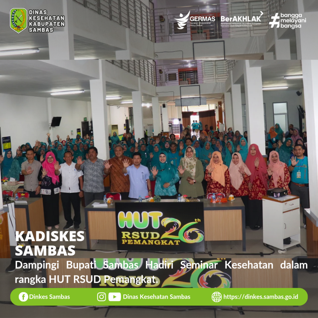 SAMBAS – Kepala Dinas Kesehatan Kabupaten Sambas dr. Ganjar Eko Prabowo, M.M., mendampingi Bupati Sambas H. Satono, S. Sos.I., M.H., saat hadiri Seminar Kesehatan dalam rangka HUT RSUD Pemangkat ke-26 Ahad ( 15/10/2023 ).