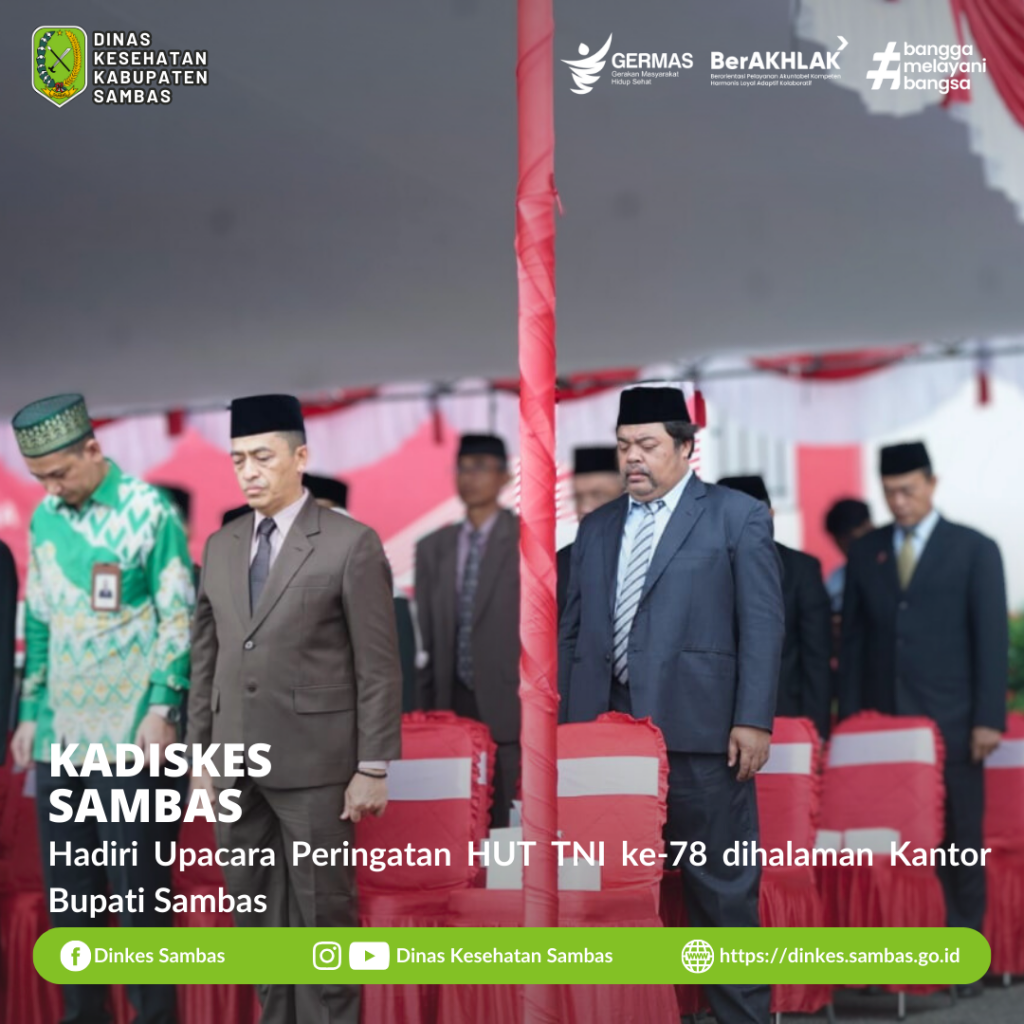 SAMBAS – Kepala Dinas Kesehatan Kabupaten Sambas dr. Ganjar Eko Prabowo, M.M., menghadiri Upacara Peringatan Hari Ulang Tahun ( HUT ) Tentara Nasional Indonesia ke-78 yang berlangsung dihalaman Kantor Bupati Sambas Kamis, 5 Oktober 2023.