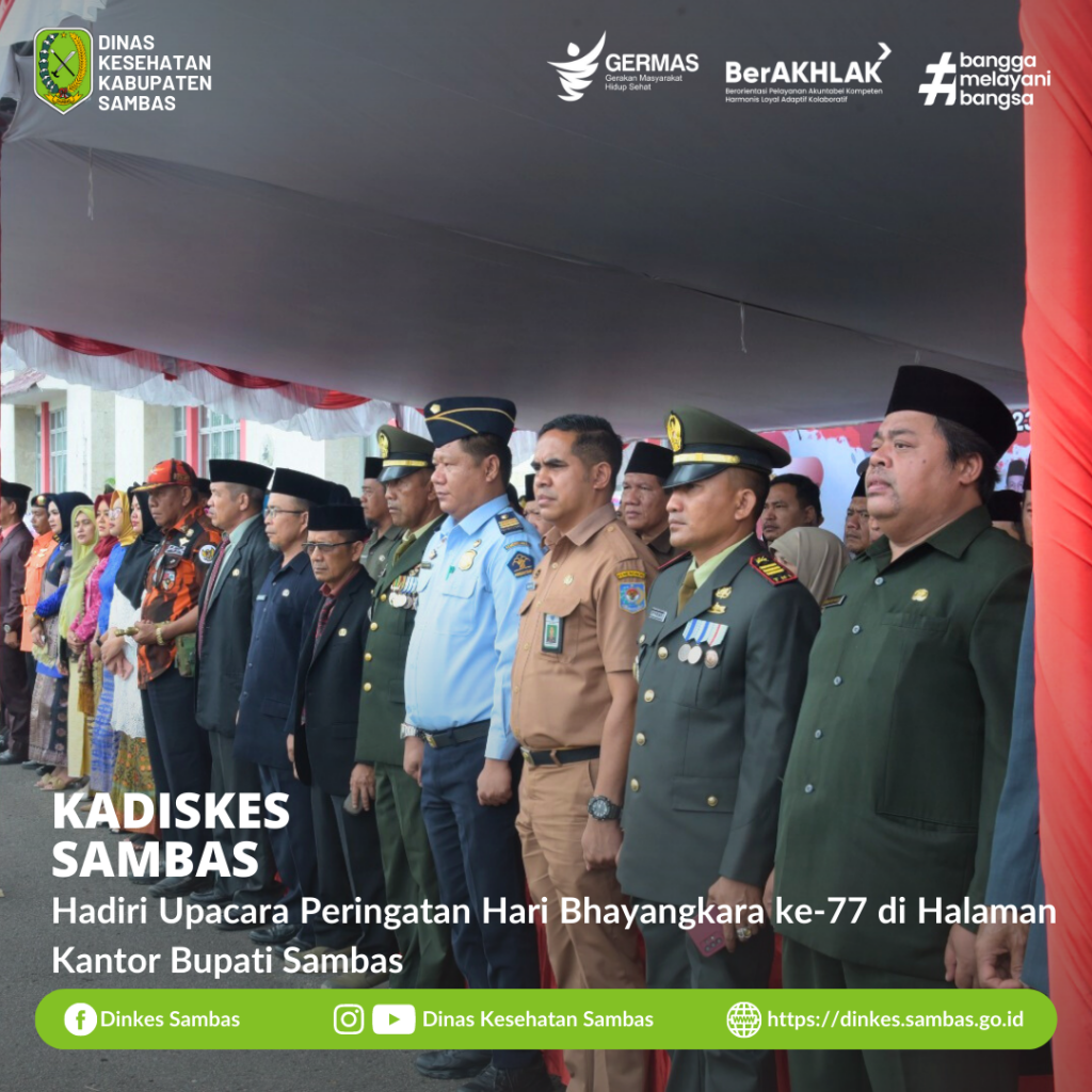 SAMBAS – Kepala Dinas Kesehatan Kabupaten Sambas dr. Ganjar Eko Prabowo, M.M., menghadiri upacara Peringatan Hari Bhayangkara ke-77 dihalaman Kantor Bupati Sambas Jalan Pembangunan, Desa Dalam Kaum, Kec. Sambas Sabtu, 1 Juli 2023.