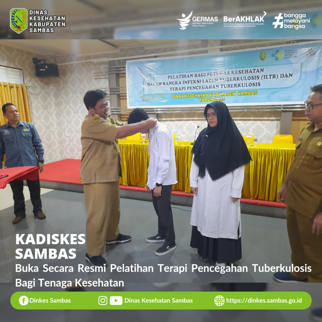 SAMBAS – Kepala Dinas Kesehatan Kabupaten Sambas dr. Ganjar Eko Prabowo, M.M., membuka Pelatihan Bagi Petugas Kesehatan Dalam Rangka Infeksi Laten Tuberkulosis ( ILTB ) dan Terapi Pencegahan Tuberkulosis di aula serbaguna Hotel Pantura Jaya Sambas Senin, 25 September 2023.