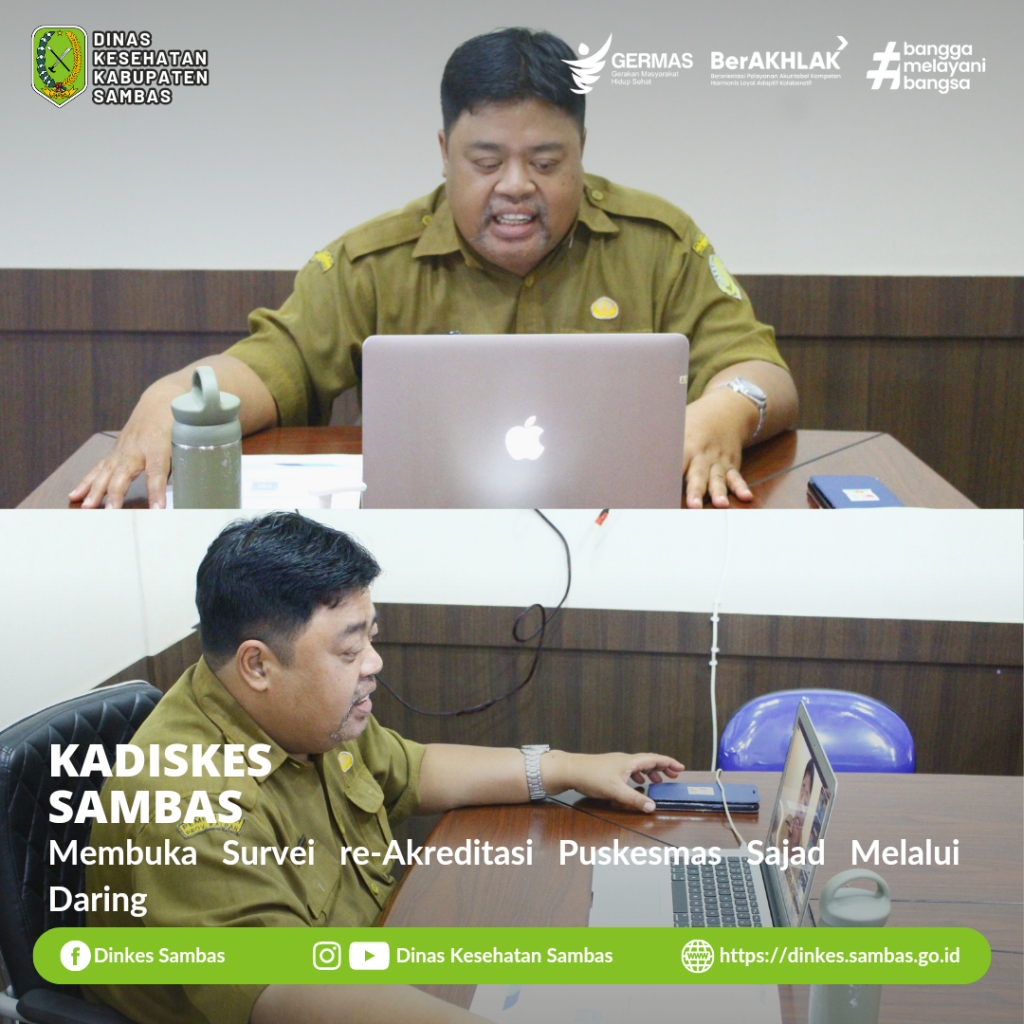 SAMBAS – Kepala Dinas Kesehatan Kabupaten Sambas dr. Ganjar Eko Prabowo, M.M., membuka Survei re-Akreditasi Puskesmas Sajad Kecamatan Sajad melalui Daring dari Ruang Kepala Dinas Senin ( 30/10/2023 ).