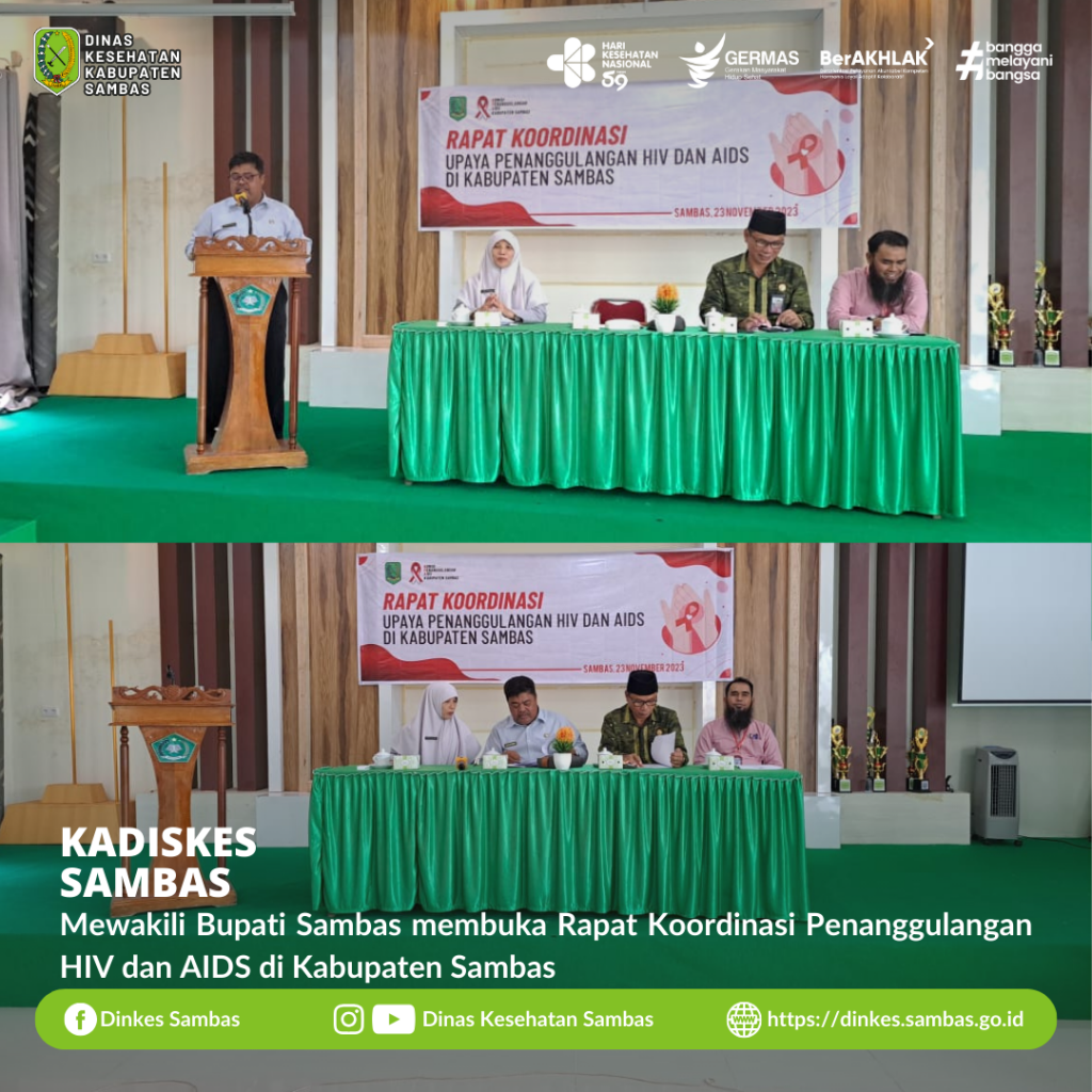 SAMBAS – Bupati Sambas diwakili oleh Kepala Dinas Kesehatan Kabupaten Sambas dr. Ganjar Eko Prabowo, M.M., hadiri dan sekaligus membuka Rapat Koordinasi Upaya Penanggulangan HIV dan AIDS di Kabupaten Sambas yang berlangsung di Gedung PLHUT Kemenag Sambas Kamis ( 23/11/2023 ).