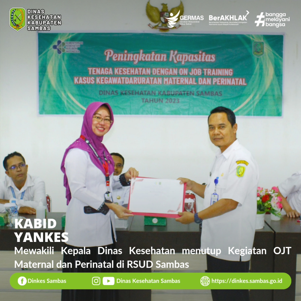 SAMBAS – On the Job Training ( OJT ) Kasus Kegawatdaruratan Maternal dan Perinatal bagi Dokter, Perawat, Bidan FKTP ke Rumah Sakit di RSUD Sambas secara resmi ditutup oleh Kepala Bidang Pelayanan Kesehatan Marzinni, S. ST. M. AP., mewakili Kepala Dinas Kesehatan Kabupaten Sambas.