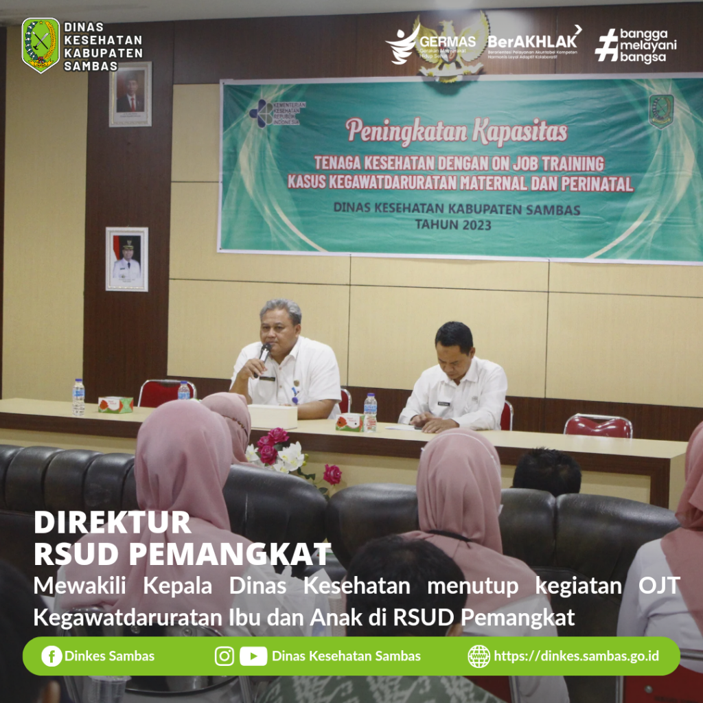 Kegiatan ditutup secara resmi oleh Kepala Dinas Kesehatan Kabupaten Sambas diwakili Direktur RSUD Pemangkat dr. Yana Sumartana, M. AP., turut dihadiri Kepala Bidang Pelayanan Kesehatan Dinkes Sambas Marzinni, S. ST., M.AP., Kepala Bidang dan Jajaran Hospitalia RSUD Pemangkat, Sub Koordinator Pelayanan Kesehatan Rujukan dan Krisis Kesehatan Dinkes Sambas.