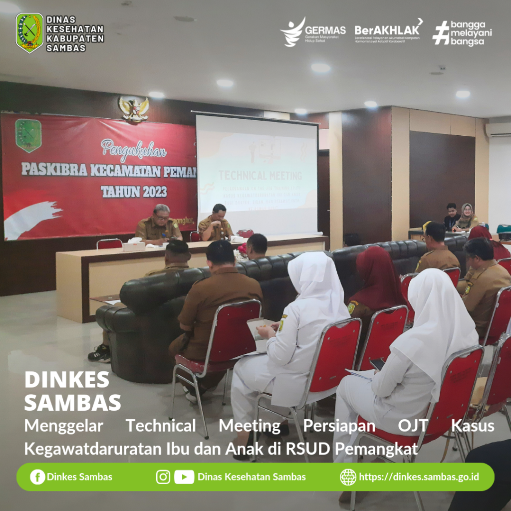 SAMBAS – Bidang Pelayanan Kesehatan Dinas Kesehatan Kabupaten Sambas menggelar Technical Meeting persiapan pelaksanaan On The Job Training ( OJT ) Kasus Kegawatdaruratan Ibu dan Anak bagi Dokter, Bidan, dan Perawat FKTP ke Rumah Sakit yang berlangsung di aula Berkemajuan RSUD Pemangkat Selasa, 12 September 2023.