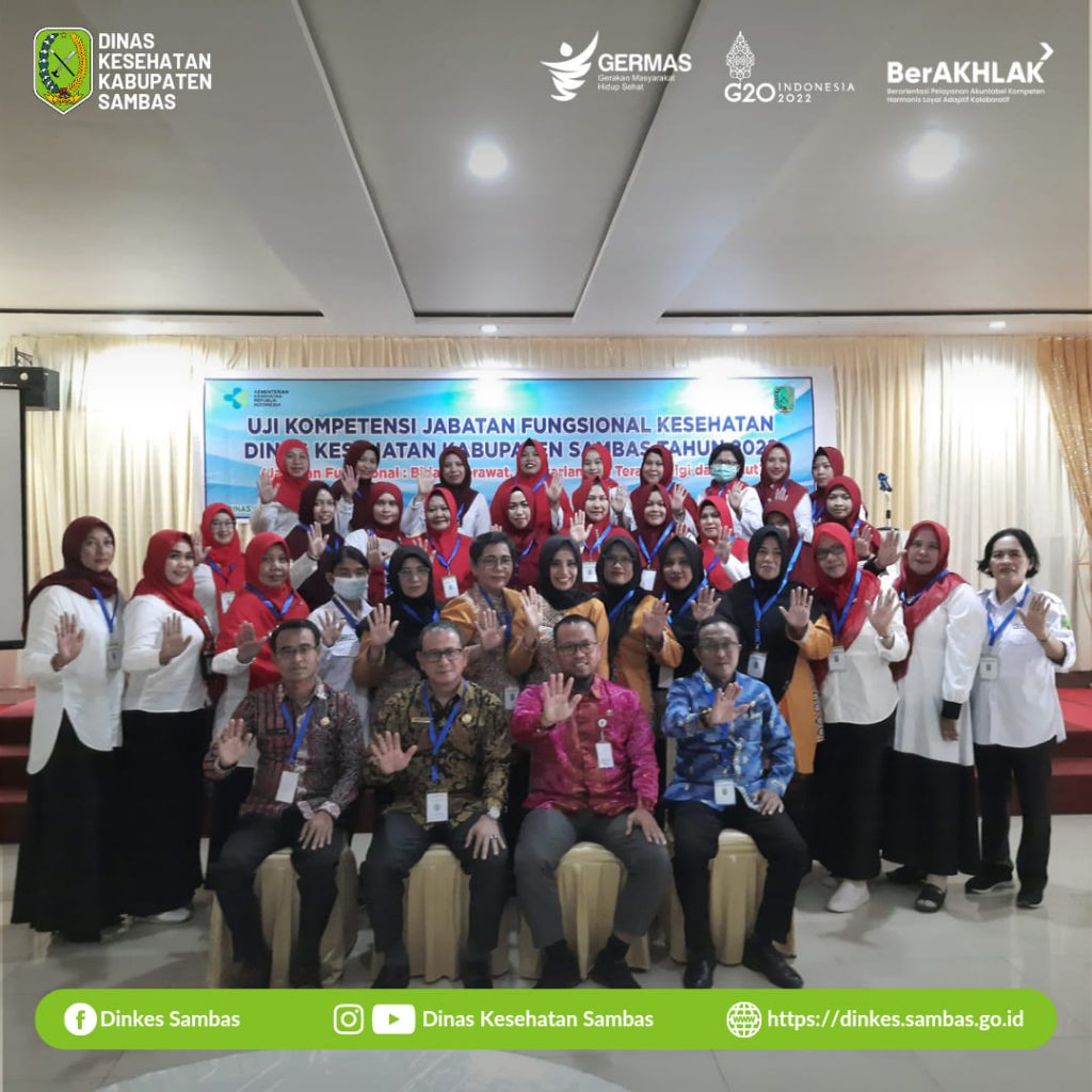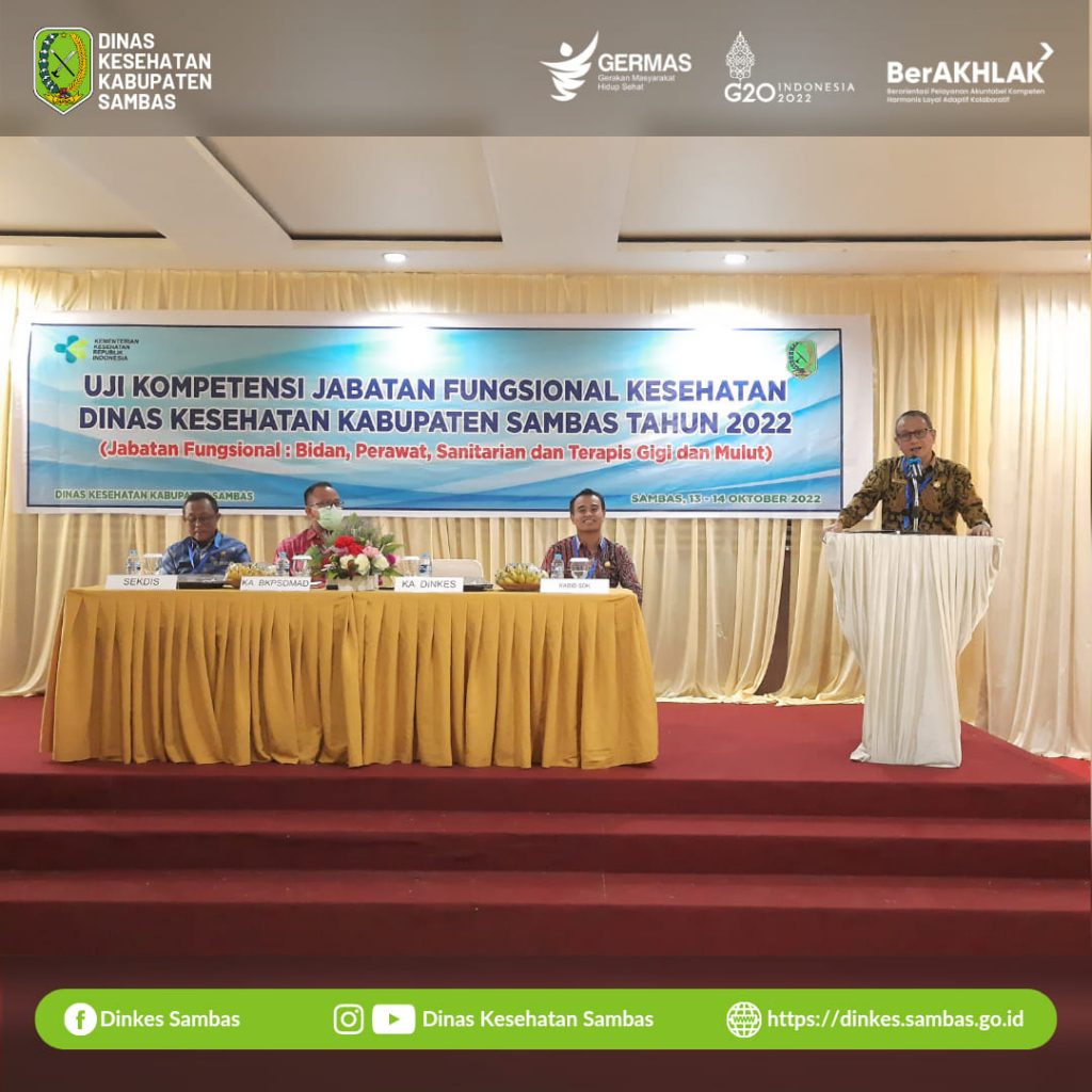 Sambas – Kepala Dinas Kesehatan Kabupaten Sambas Hendy Wijaya, SKM., MPH., membuka secara resmi kegiatan Uji Kompetensi Jabatan Fungsional Kesehatan Dinas Kesehatan Kabupaten Sambas tahun 2022 di Aula Hotel Pantura Jaya Sambas Kamis, 13 Oktober 2022.
